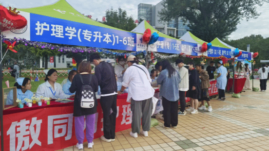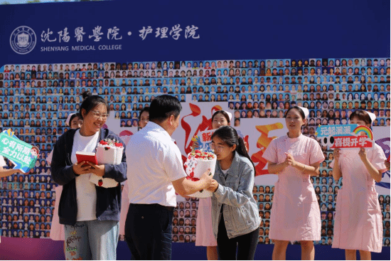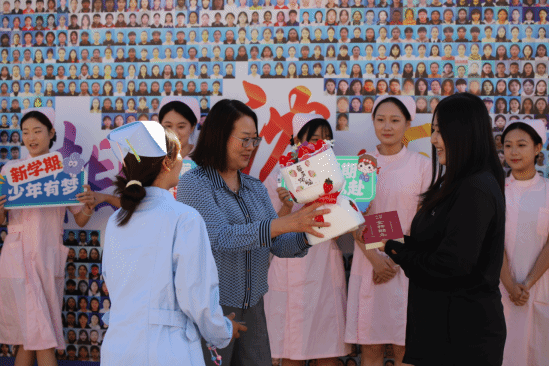 的优良传统,学生们身穿粉色护士服,从仪容仪表到站姿、走姿,从微笑服务到沟通技巧,无不展现了护理人员的专业形象,吸引了许多新生驻足观看,将专业形象与温馨氛围完美融合。开学日与生日撞了个满怀,在这样一个特别的日子里,学院为过生日的同学们准备了温馨的庆祝活动。生日歌的旋律在空中回荡,送出手捧花,表达对新生的真挚祝福和欢迎,并把郭宏院长亲笔题词的书籍作为生日礼物,更是一份珍贵的精神食粮,院长的题词不仅是对新生个人的鼓励,也是对其学术追求和职业发展的期许,整个迎新场地充斥着欢乐与温馨。