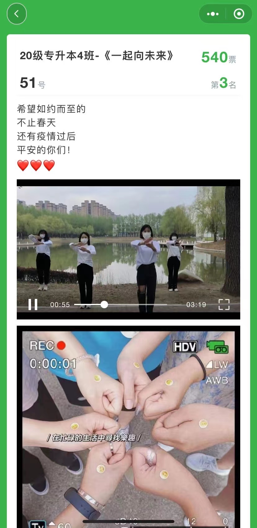 本次比赛同学们自行录制视频上传至微信小程序,进行了为期3天的线上评比。通过作品,我们能听见同学们嘹亮的歌声,感受到扑面而来的属于我们这一代人的青春气息,慷概激昂的和弦、振奋人心的歌词、和谐优美的合唱,彰显着同学们内心对封校生活所保持的乐观心态。同学们用歌声创造出了一种欢乐而轻松的氛围,她们用歌声传达爱,把爱当做武器,积极抗击疫情,共同期盼美好的未来,同学们能在封校生活中感受到学习之外的快乐。