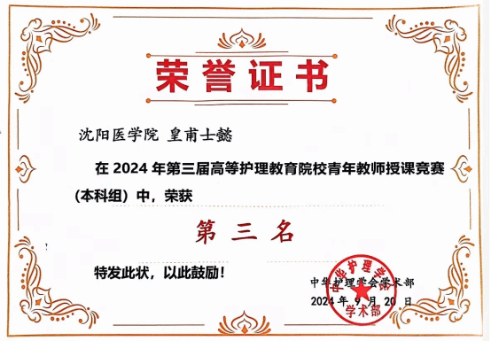 在9月20日于厦门举行的“2024年第三届高等护理教育院校青年教师授课竞赛”中,我院青年教师皇甫士懿助教以其优异的教学才能和创新的教学方法,荣获全国本科组第三名,为学校再添荣誉。这场由中华护理学会高等护理教育专业委员会主办的赛事,以“医教协同·改革创新·持续发展”为主题,汇聚了全国31个省、市、自治区的169所院校的171名护理教师,共同展现了护理教育的创新与活力。 在前期辽宁省选拔赛中,皇甫士懿助教以第二名的佳绩突围,...
